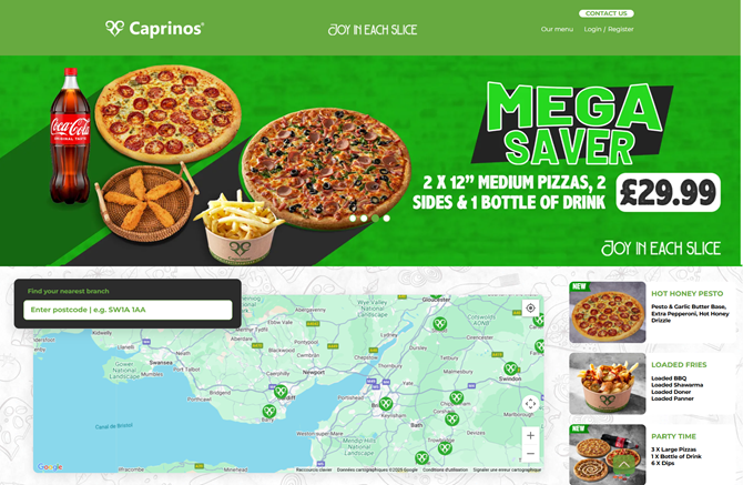 Design sur mesure du site vitrine et du site de commande en ligne. Page de localisation du restaurant le plus proche avec validation de la zone de livraison. Formulaire d’inscription à la newsletter. Économies réalisées mises en avant dans le panier. Panier rétractable. Programme de fidélité standard. Bannières personnalisables. Tags pour identifier graphiquement certains types de produits. Push produit. Filtres pour identifier graphiquement certains types de produits ou spécificités. Menu déroulant. Paiement en un clic avec sauvegarde des coordonnées bancaires. Intégration Google Maps. Application mobile.